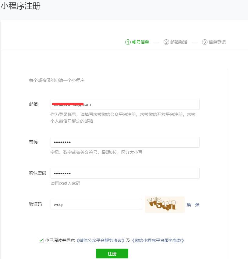 (4)填寫小程序賬號和密碼,點擊提交后,前往郵箱查看微信激活郵件,點擊鏈接激活。(注意:必須使用新郵箱,不能使用注冊公眾號的郵箱,此郵箱密碼就是登錄小程序后臺使用)