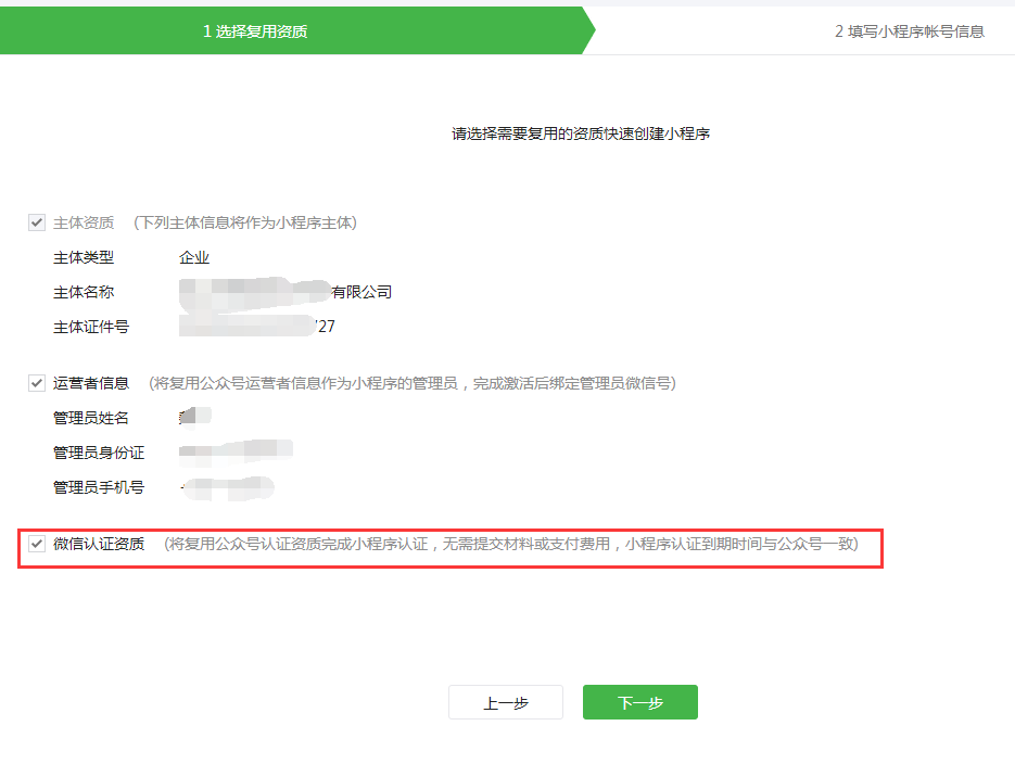 1)運營者信息勾選后可繼續(xù)使用公眾號的運營者管理小程序,若不勾選,那么小程序管理員可另外設(shè)置(后面的步驟里面會讓設(shè)置管理員信息)。
